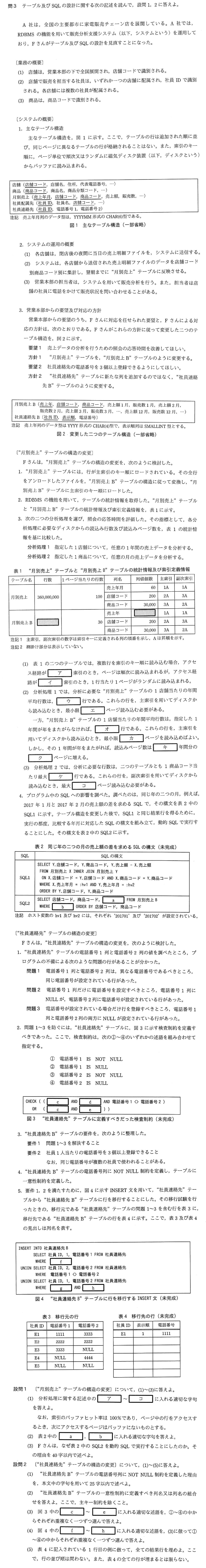平成29年度春期午後Ⅰ【問3】 X Facebook LINE 2024.04.282024.05.14 設問1解答例 (1) ア. 主、イ. 副次、ウ. 360,000、エ. 3,600、オ. 30,000、カ. 1,000、キ. 2、ク. 2,000、ケ. 200、コ. 200 (2) a. 売上額 2 月 – 売上額 1 月b. 売上年 = ‘2017’ 又は 売上年 = ? (3) 比較する売上年月ごとに選択リストの列名を変更しなければならないから 設問2解答例 (1) 電話番号が設定されている行だけを登録したいから (2) 社員 ID,電話番号 又は 電話番号,社員 ID (3) c. ①d. ③e. ④ (4) f. ①g. ②h. ③ (5)